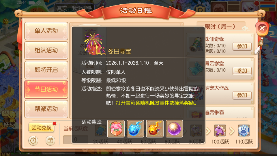 2026年1月1日-1月10日23:59,等级≥30级的少侠可以单人参与【冬日寻宝】活动!打开【活动】-【节日活动】-【冬日寻宝】,与冬日宝贝对话,即可传送至冰雪世界地图,打开地图中的宝箱会随机触发事件或掉落丰厚奖励。