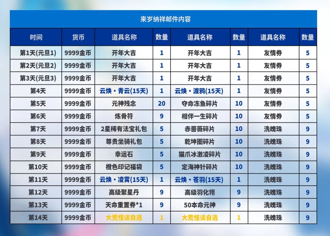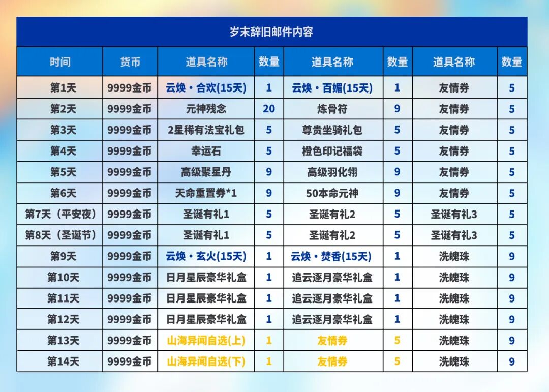 从2025年12月18日至2026年1月14日,少侠们每日登录游戏即可通过邮件领取专属辞旧迎新登录好礼。最近我们对邮件的奖励内容进行了升级,升级后具体邮件内容如下: