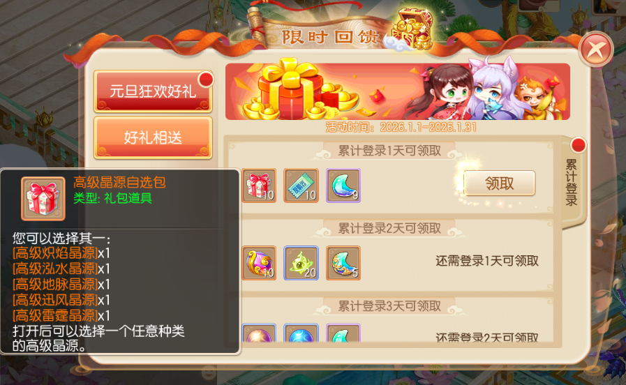 元旦狂欢好礼来啦!2026年1月1日起累计登录即可获取珍稀奖励和各种礼包,不容错过哦~