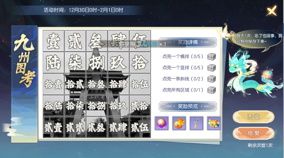 在活动中点亮图考一条横排,将可获得丹魂、丹魄、募灵玉;点亮一条竖排,将可获得高级羽化翎、高级聚星丹、紫色魂器礼盒;点亮一条斜线,将可获得高级书福袋、超级书福袋、金色魂器礼盒;点亮所有区域可以获得1星灵器自选礼包、蜀山一梦兑换道具和10龙币奖励。