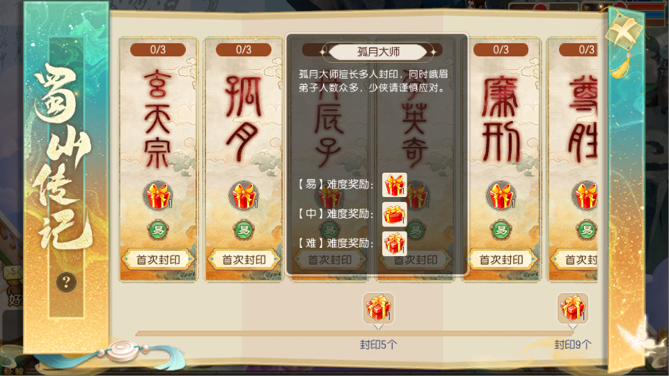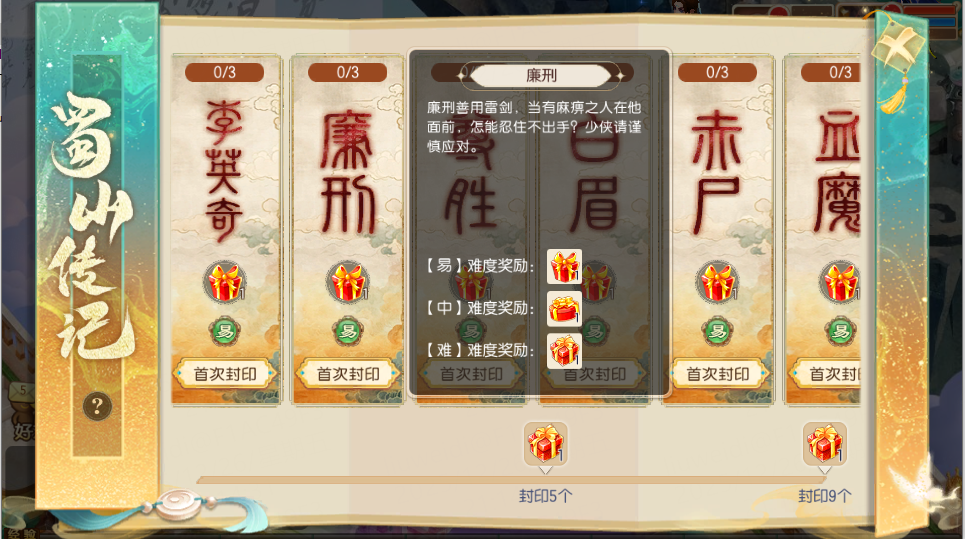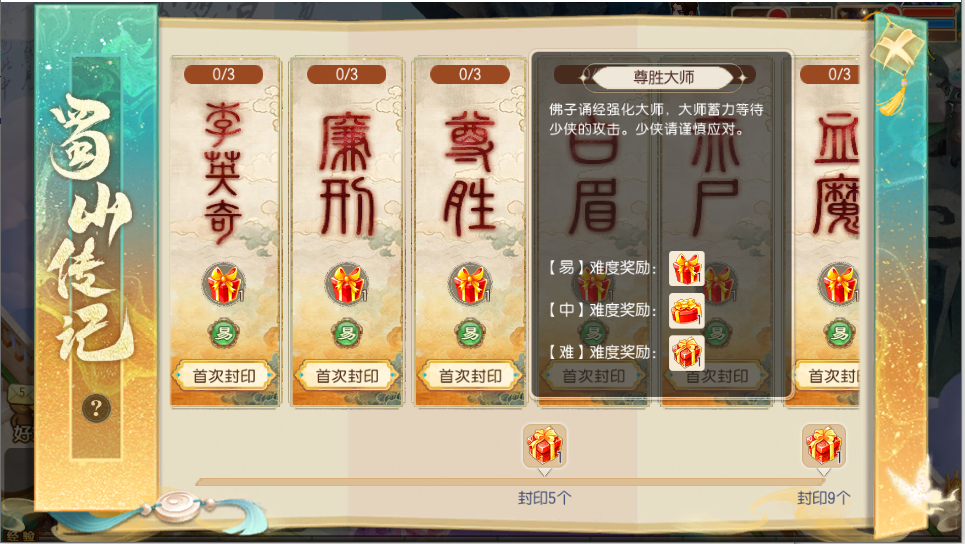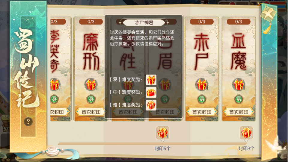 每个关卡需要进行三次封印,每次封印后下一次封印的难度将提高,每次封印成功将获得奖励。前6个关卡三个难度的都通关后即为完全封印,后3个关卡通关前2个难度即可完全封印。后3关最高难度为强力关卡,需要少侠具备强大实力才可通关!关卡介绍中会有推荐战力提示。当少侠完全封印次数达到5次和9次可以领取累计封印奖励。
