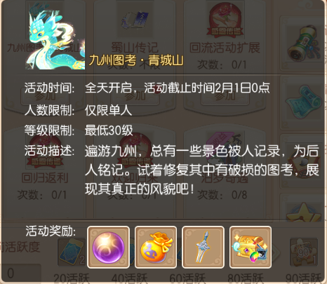 205年12月30日至2026年2月1日0点,等级≥30级的少侠可以单人参与【九州图考·青城山】活动。本次九州图考将带各位少侠去领略我们国家四川省的名山,青城山。