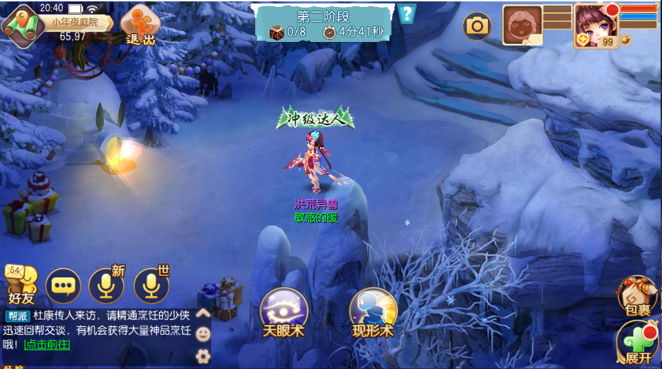 在活动的第二阶段中,少侠将会获得两个技能:天眼术和现形术。天眼术能帮少侠看到躲起来的鬼怪,现形术则能够让他们显形。当找到8个鬼怪后即可完成这个阶段,但同样的如果在规定时间内没有找到全部鬼怪,将按照找的个数发放奖励。