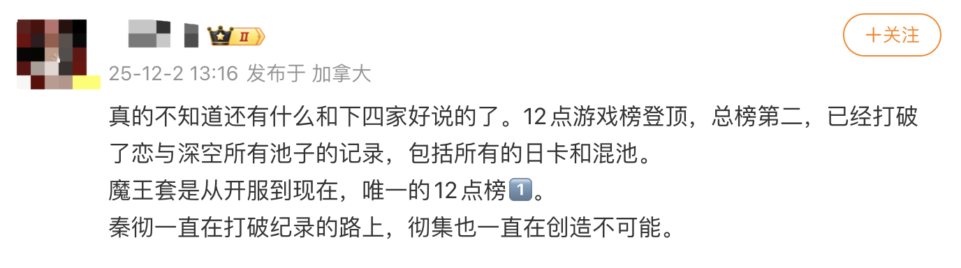 随着「银翼安魂地」的实装,以及新五星日冕套装思念「秦彻·猩红席卷」「秦彻·猩红弥散」的限时开放获取,玩家的热情很快就将《恋与深空》再一次推到了市场聚光灯的C位上。更值得一提的是,有玩家指出,这是《恋与深空》头一次在中午12点就成功登上游戏畅销榜首的,可以说是刷新了游戏的最快登顶纪录。