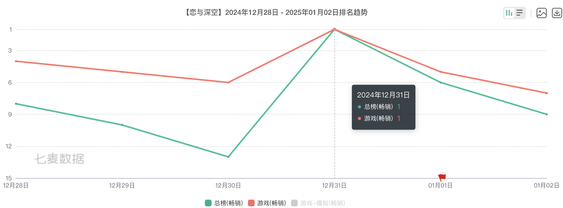 午休一觉醒来,12月2日国内商店畅销榜首就换人了。中午12点,刚刚更新完开服的《恋与深空》排名突然从46位飙升到了榜首,到下午4点左右更是冲上了畅销总榜第一。在登顶畅销总榜之后,官方随即宣布将为全服玩家派送包括20连抽以及丰厚材料的登顶福利。