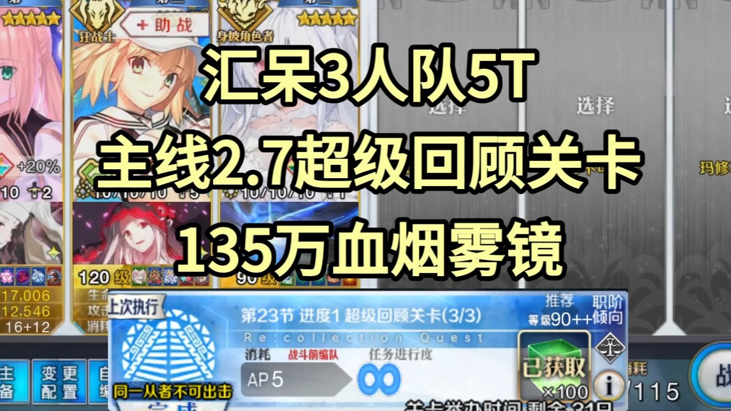 【FGO】135万血烟雾镜汇呆3人队5T主线2.7回忆本第23节超级回顾关卡90++爆破攻略