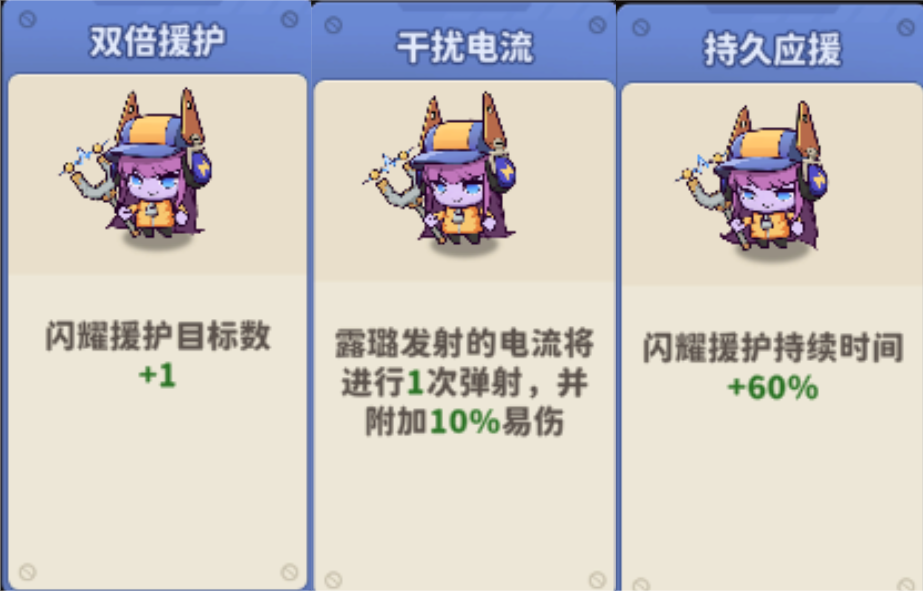 露璐强化推荐:【干扰电流】、【双倍援护】、【持久应援】