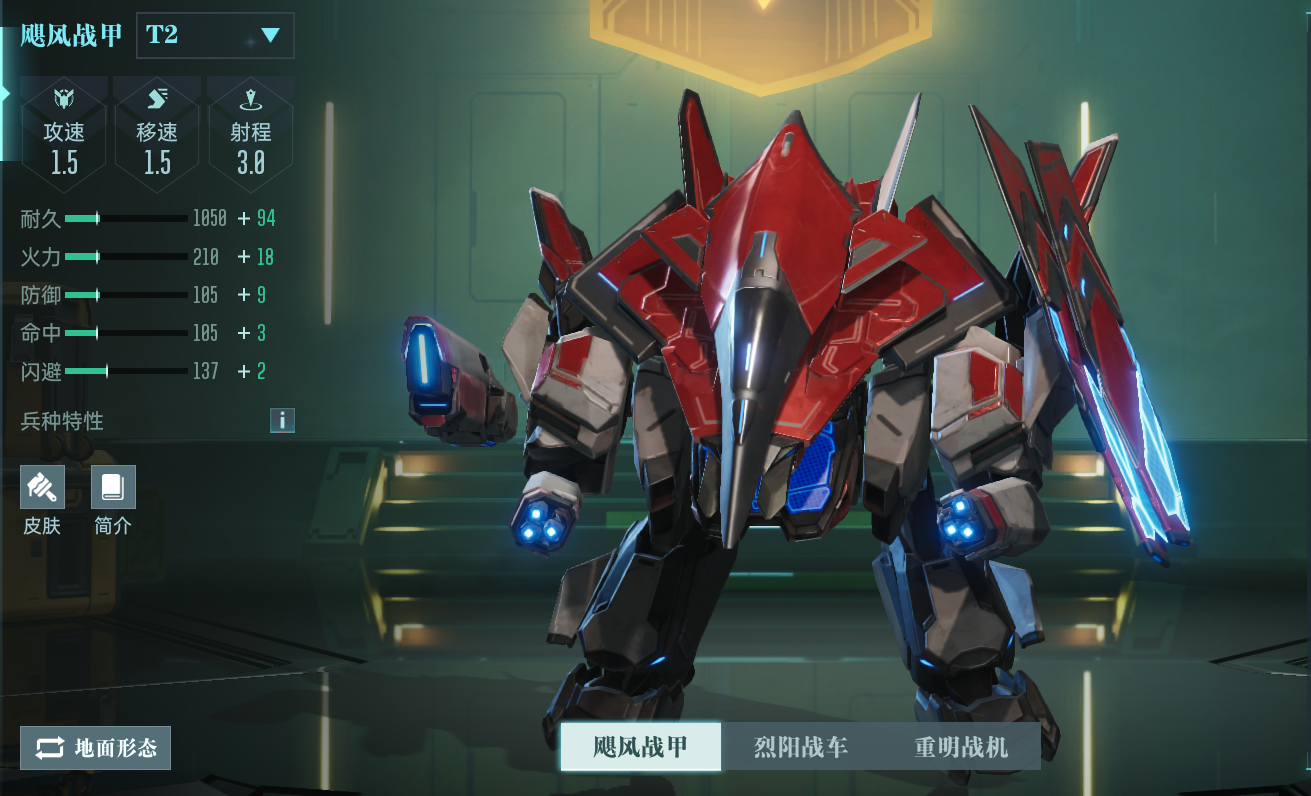 同时,不同兵种的闪避和命中也各不相同,飓风战甲闪避最高,最适合还击队使用。