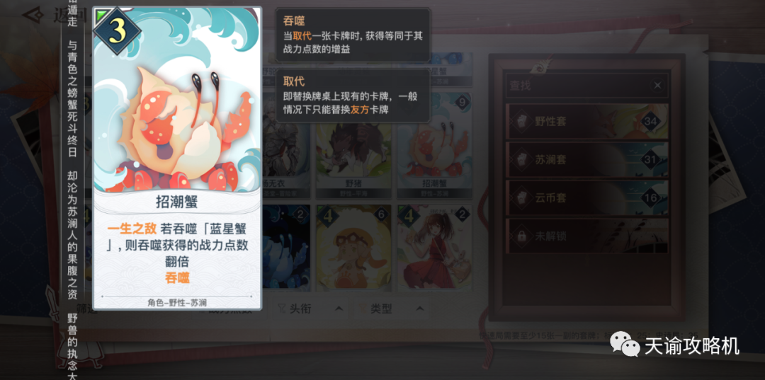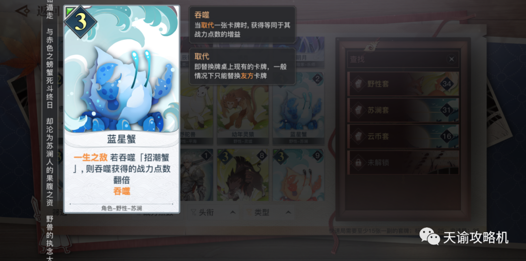 招潮蟹、蓝星蟹以及草原狐这三种卡牌都带有吞噬效果,可以在替换掉当前位置的己方卡牌后,按照一定规则,在自己原有战力的基础上,继承或者翻倍继承被替换掉的卡牌剩余的战力。