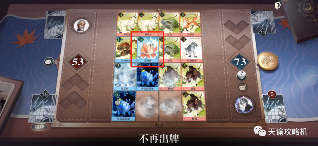 之前的一场牌局,因为我的手牌最开始给的就是多只蓝星蟹和招潮蟹,所以后面干脆通过换牌换出了更多的蟹,然后在一个位置上来回吞噬。当时是4*4的牌局,16格,我的牌一共占了5格,对方占了9格,最后出了一张【兽血奔流】结算下来,我的牌总战力还比对方高20,就因为其中一个招潮蟹卡牌的最终战力是46。