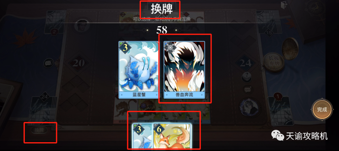 注:野兽套不管打什么流派,核心都是最后用传说牌【兽血奔流】去结算,但如果一开始给我们的手牌里没有这张传说牌,那么就在每次轮到你出牌时,在换牌区里找找有没有【兽血奔流】,有的话能换出一张最后一轮使用就行。
