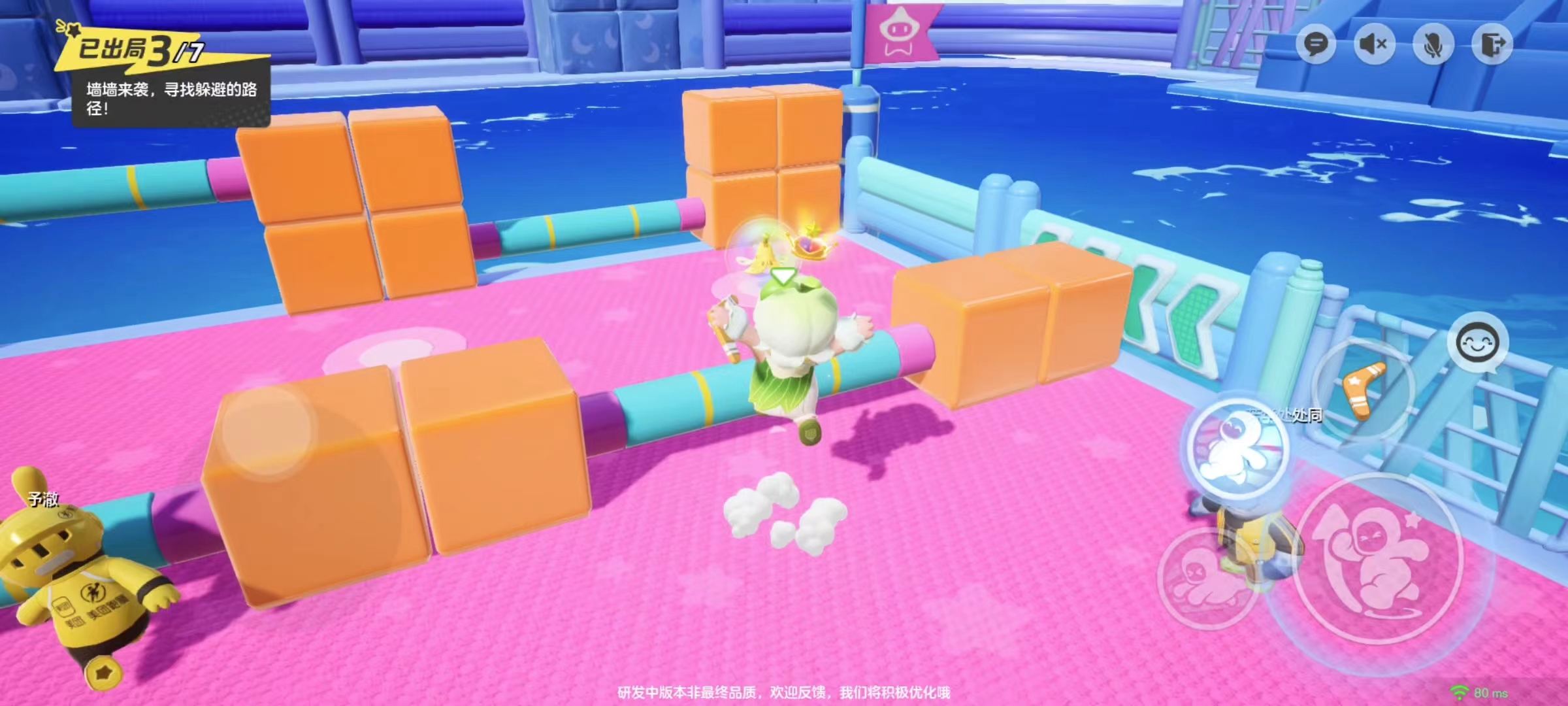 在游戏开始后,开局正面方向会匀速出现墙体,墙体匀速的向小伙伴袭来。小伙伴需要在有限的空间中躲闪墙体,避免因墙体的推撞而掉出平台。