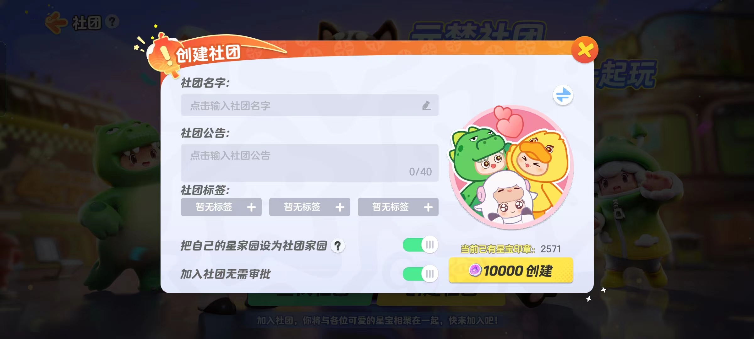 如果星宝想创建属于自己的社团,就要自己想好社团名和公告,邀请其他星宝加入~