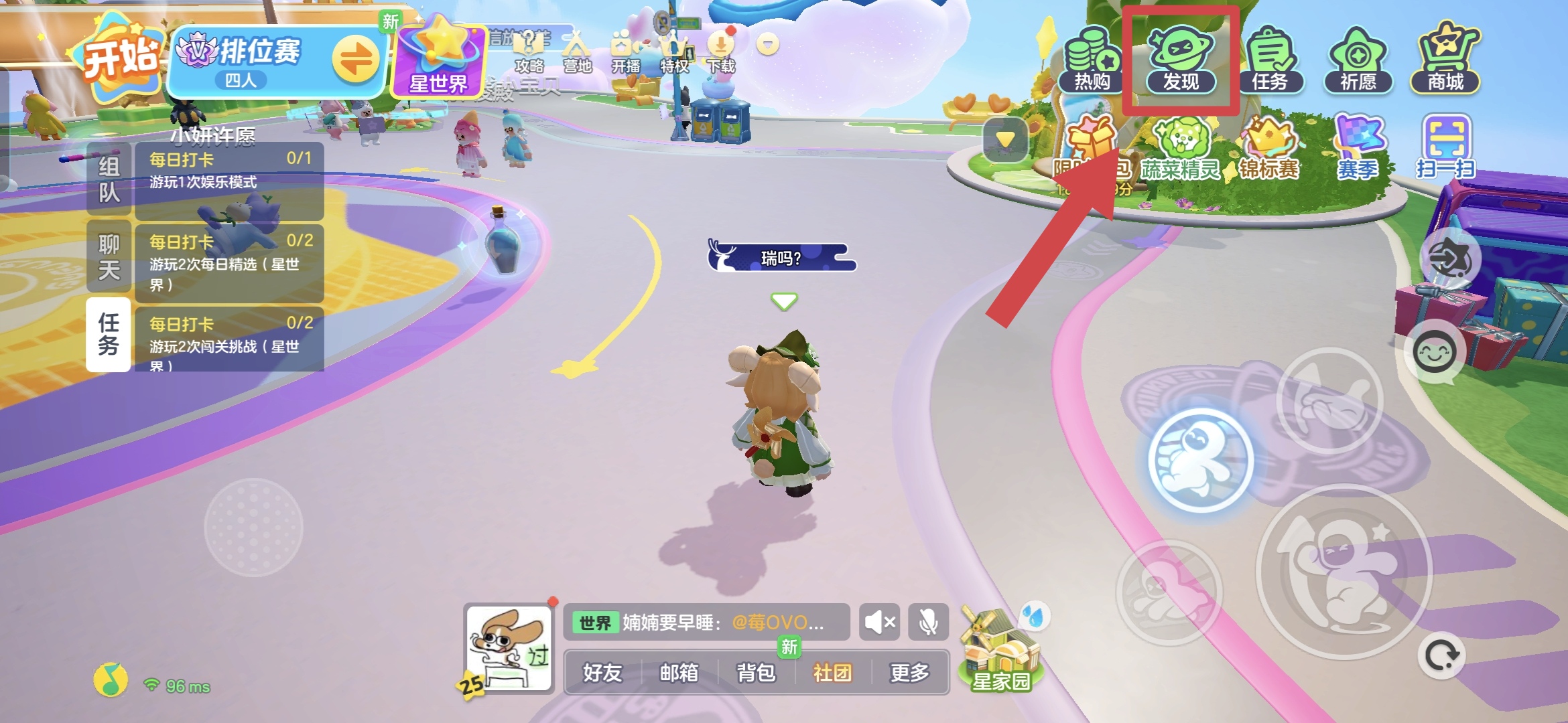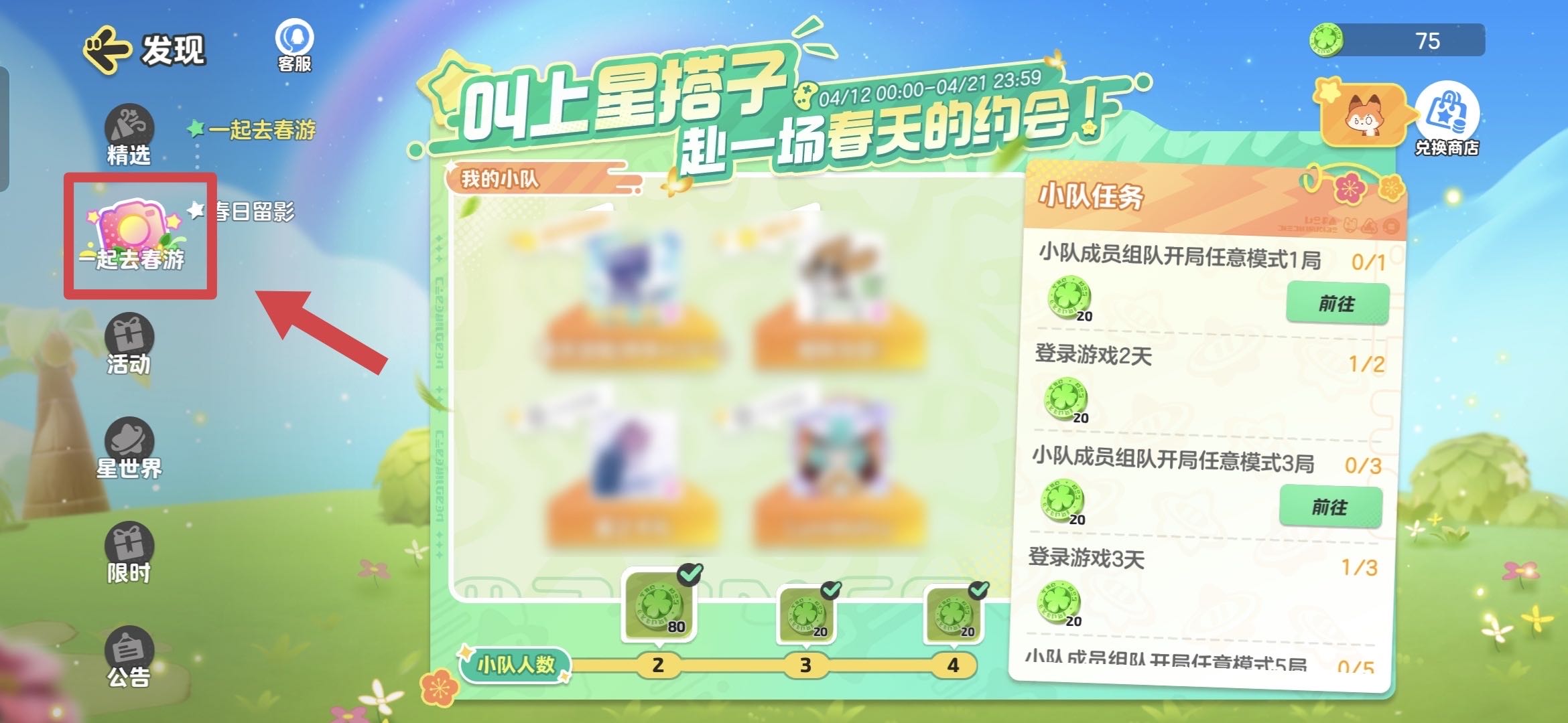 首先进入【发现】页面,左边第二栏一个花朵般的粉色相机尤其吸引目光,这就是【一起去春游】的活动入口啦!点击空位上的加号,把活动链接分享给星搭子,就能邀请新队员加入,小队人数每增加一人,所有成员都能领取代币奖励哦~
