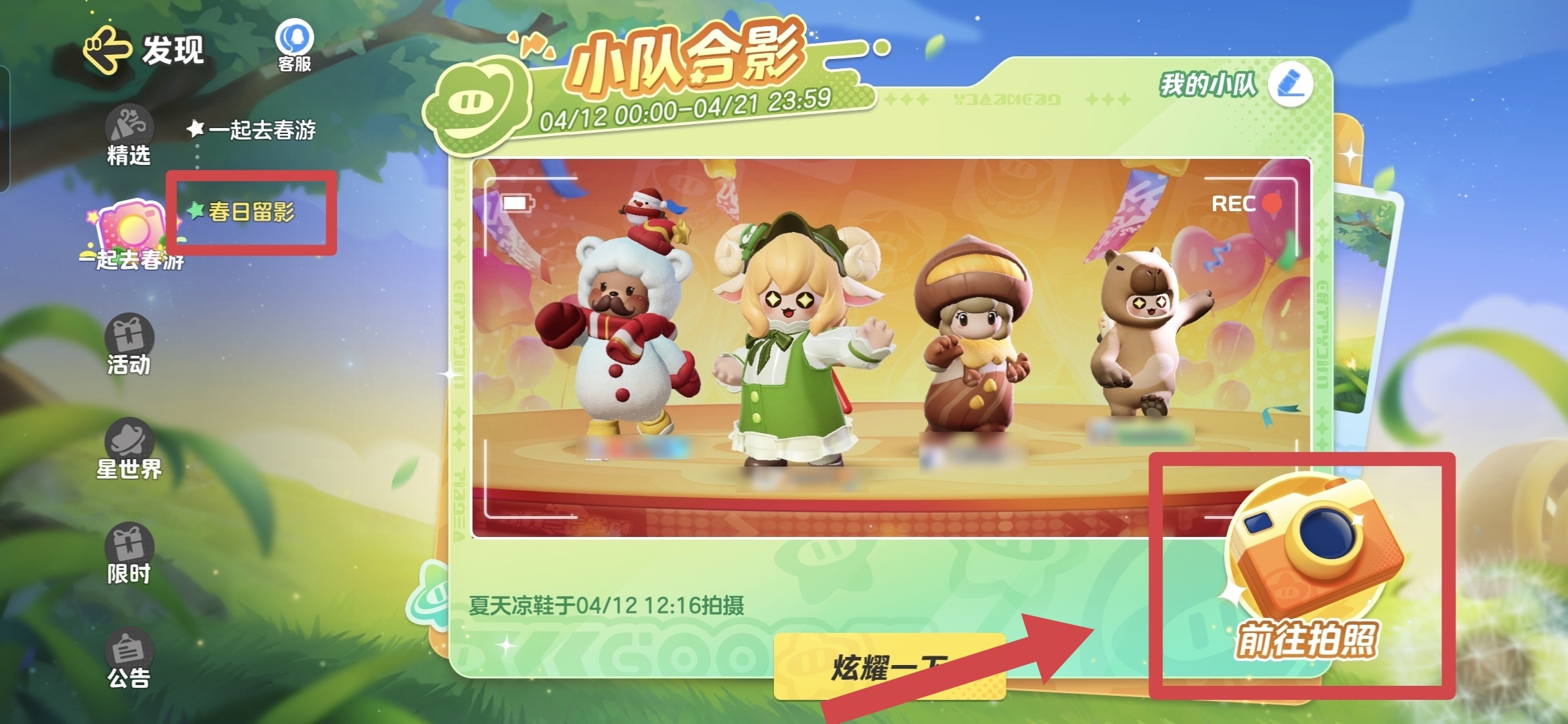 看到这里星宝也许要问,组队任务中的合影要怎么完成呢?看这里!从左侧小标题中的【春日留影】进入页面,一张有着所有队员星宝形象的相纸已经出现在眼前啦~点击右下角橙色相机前往拍照,就可以进行小队合影啦~