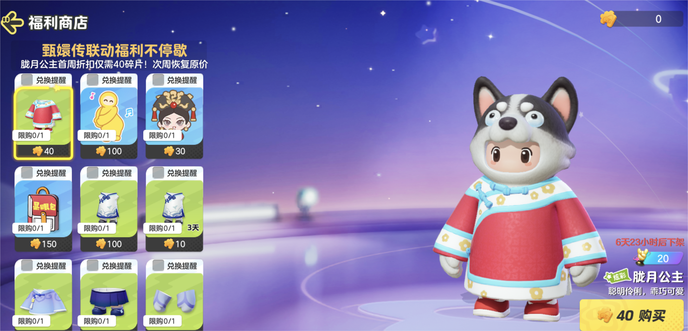 7月19日起,福利商店惊喜上新,《甄嬛传》联动不停歇,时装:胧月公主上架享福利,首周折扣仅需40碎片!次周恢复原价,还有稀有表情:熹贵妃禁言等你拿下!