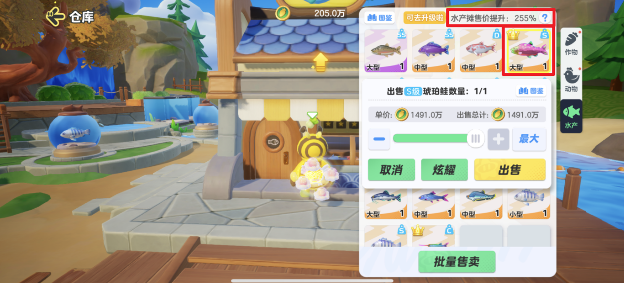 此时如果水产仓库里面有鱼也不要卖出,留着等到手里的钱足够升级鱼摊之后再卖出,刚好可以叠加水产摊的5%售价加成(40级对应195%加成),优先升级鱼摊要比直接钓到就卖划算得多哦