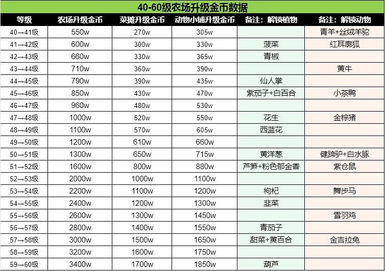 在这之中最符合我们既要搞金币,又要均衡发展的农场搭配还得是粉色郁金香(Lv52)+舞步马(Lv54)/黄牛(Lv44)组合!菜地专注搞金币,牧场主金币、附带增加经验值,也为升级提供一些经验补充,具体的数据星妹同样整理在下面啦~