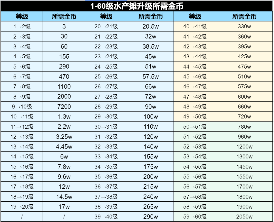 在上面这几个渔场升级选项中,要想收拢资金更快的话,星妹首推水产摊升级。而要让水产摊追上农场等级,从1级升级到40级共需要花费2562w金币。