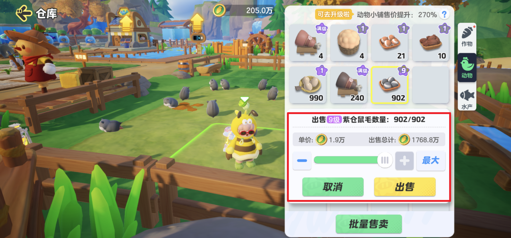 A. 牧场这边最好不要“雨露均沾”地什么都养,否则这样动物升级的速度很慢,售价提升得也会很慢,尽可能集中地养1-2种动物会效益最大化哦~