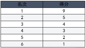 2. 在组队巡回赛中,最多两名玩家组队参赛,且组队玩家间排位差距不超过2个等级。每场对局共有六人参赛,在官方赛事地图上进行比赛。第一名玩家冲过终点线后,开始10秒倒计时,倒计时结束未冲过终点线玩家按距终点线先后顺序排名次。按排名先后获得不同分数,由高到低分别为: