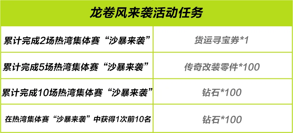 参与热湾集体赛第二期,体验肾上腺素飙升的快感!还可获得钻石、货运寻宝券、传奇改装零件等丰厚奖励,一起来跟风暴比一场惊险刺激的比赛。