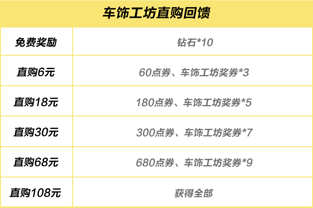 活动期间,参与即可免费领取钻石*10。参与限时直购更可获等额点券和车饰工坊奖券好礼~
