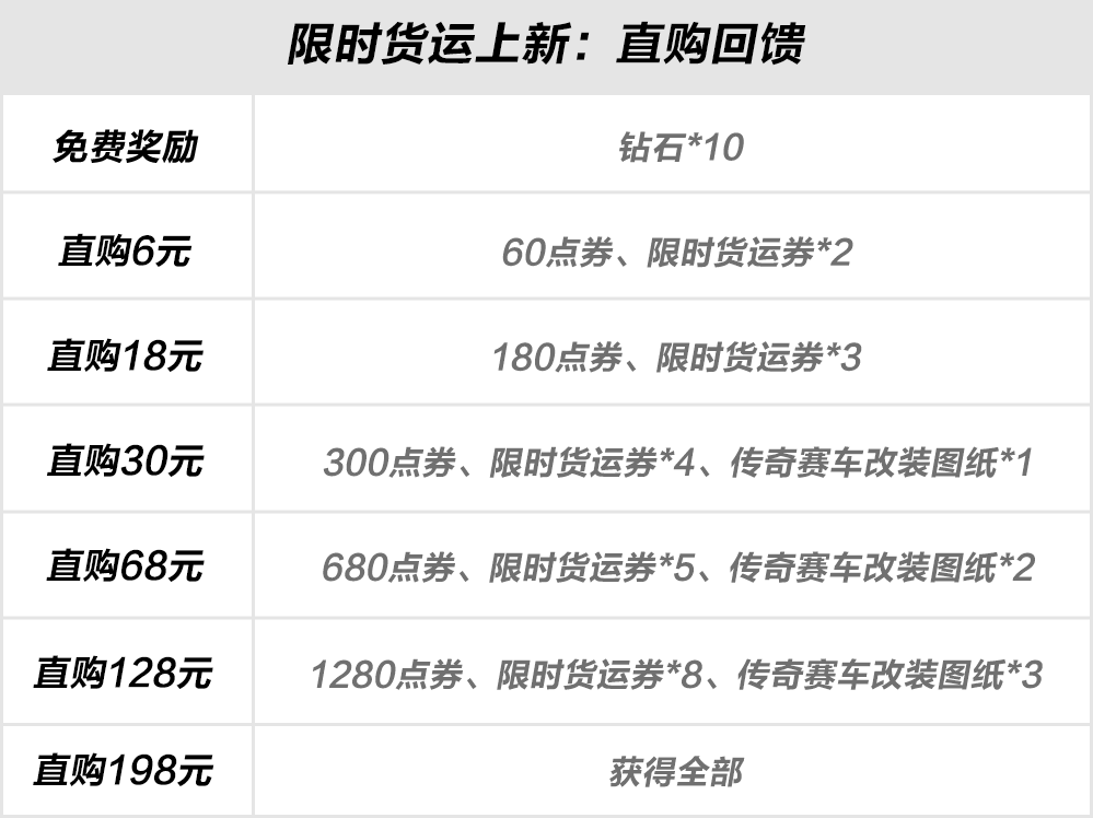 活动期间,免费领取钻石*10,直购即返限时货运券、传奇赛车改装图纸回馈好礼,助力赛车手们提车即高配!