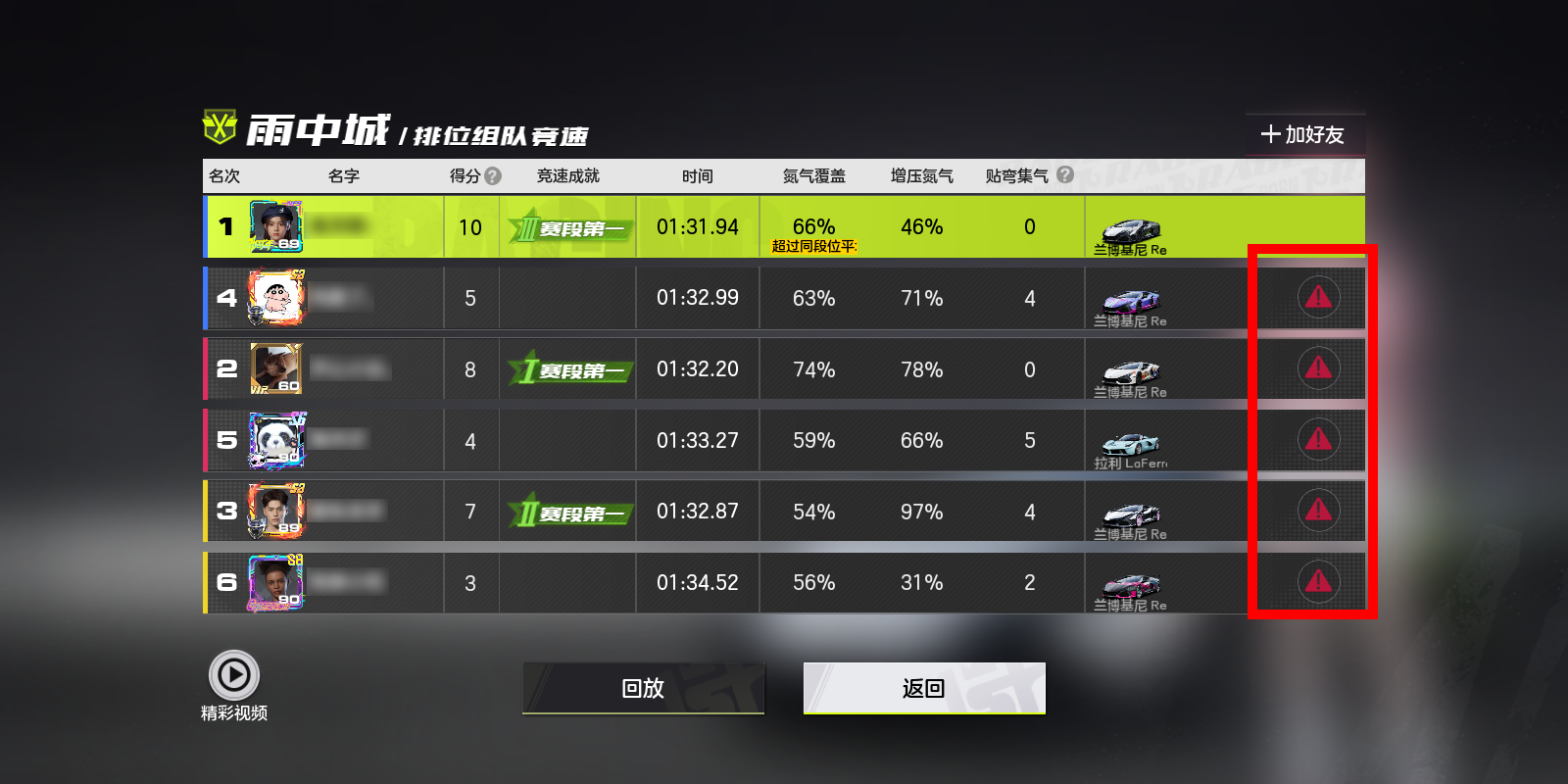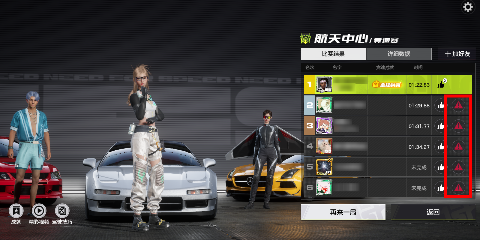 错过即时举报的赛车手们也可以通过个人空间-对局页面中查看历史对局详情后,点击举报按钮并根据违规类型发起举报。