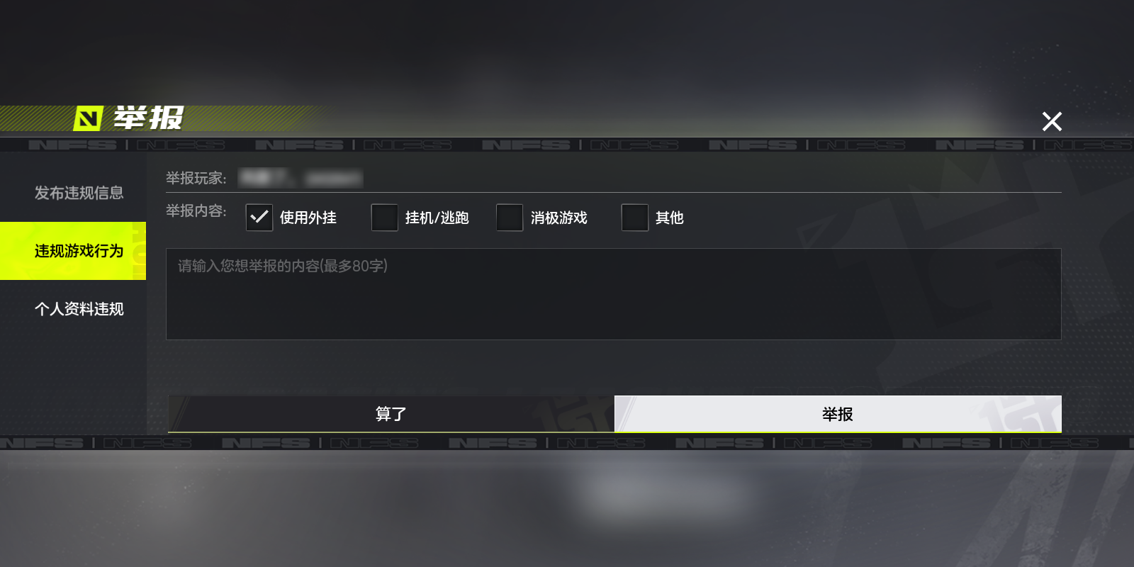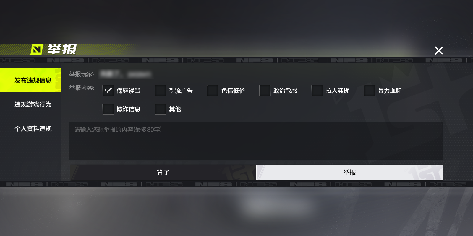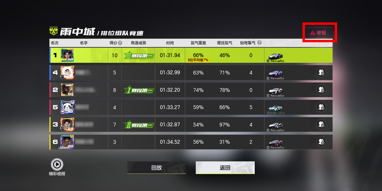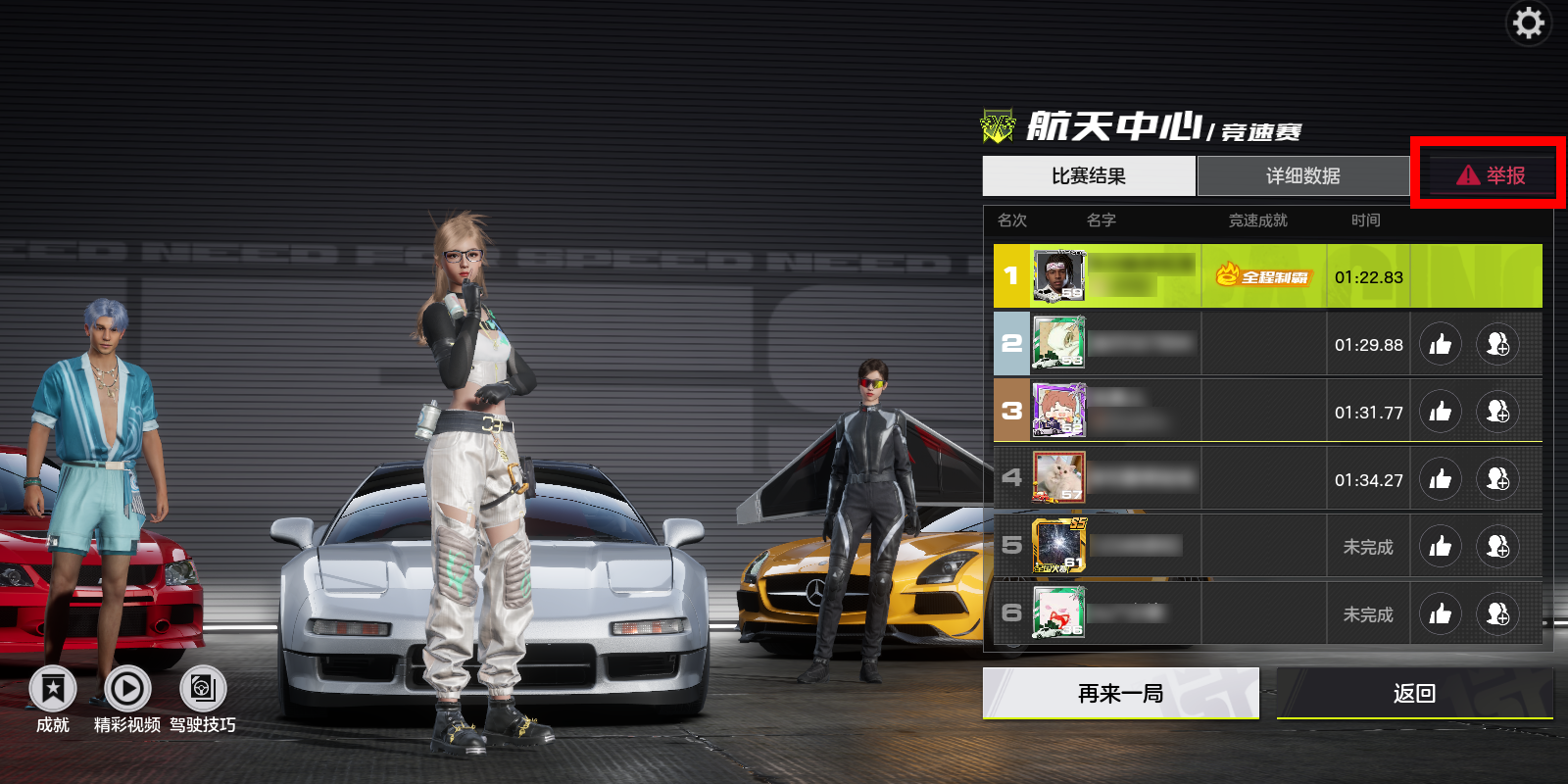 赛车手们可在游戏对局结束后的结算页面,按照如下步骤,点击举报按钮并根据违规类型发起举报。