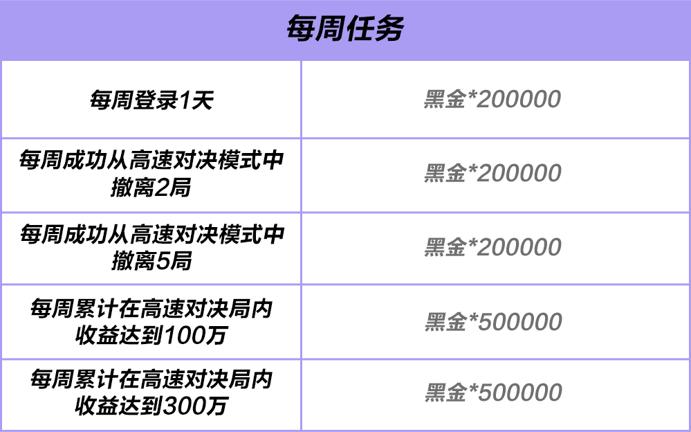 活动期间,登录游戏、参与高速对决并成功撤离或是累计收益达到指定目标,即可在活动页面领取黑金奖励,助你全速启航!