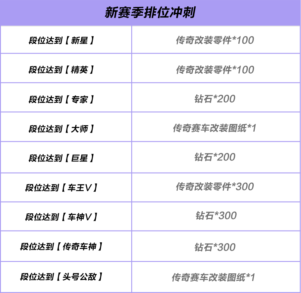 活动期间参与排位赛,向着更高段位发起冲击。每攻克一个段位挑战任务,就能解锁对应奖励,钻石、传奇改装零件和传奇赛车改装图纸好礼等你来拿。新赛季的传奇,正从你的下一次加速开始书写!