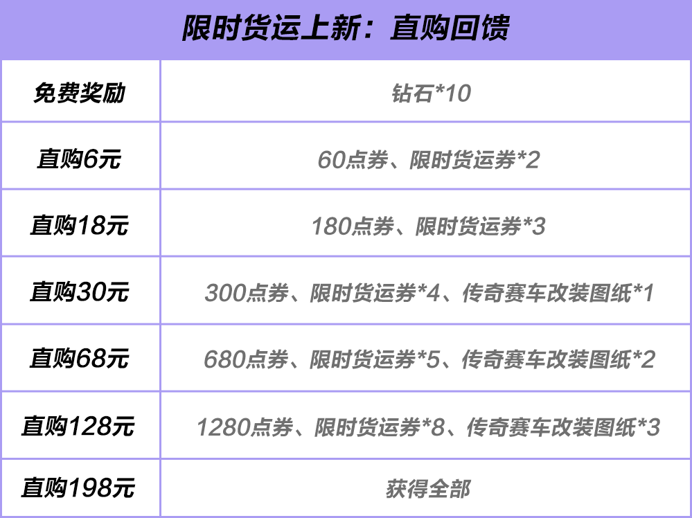活动期间,免费领取钻石*10,直购即可优惠获取限时货运券、传奇赛车改装图纸回馈好礼,助力赛车手们提车即高配!