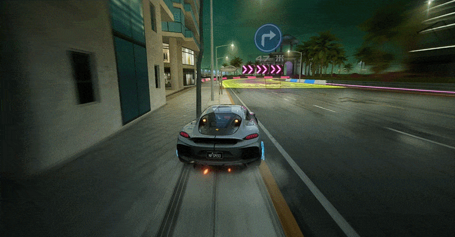 极乐海岸属于简单极速赛道,很适合科尼赛克 Gemera发挥自身优势,几乎全程都能触发惯性蓄能集气强化”特性,在腾空路段时还能激活“赛规底盘控制Ⅱ”特性,快人一步。