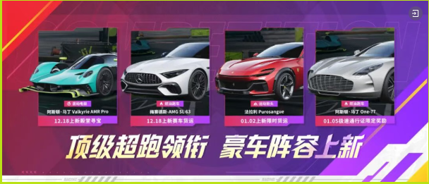 新版本新体验,全新豪车阵容:殿堂赛车阿斯顿·马丁 Valkyrie AMR Pro以及梅赛德斯-AMG SL 63、法拉利 Purosangue、阿斯顿·马丁 One-77即将陆续登陆热湾。