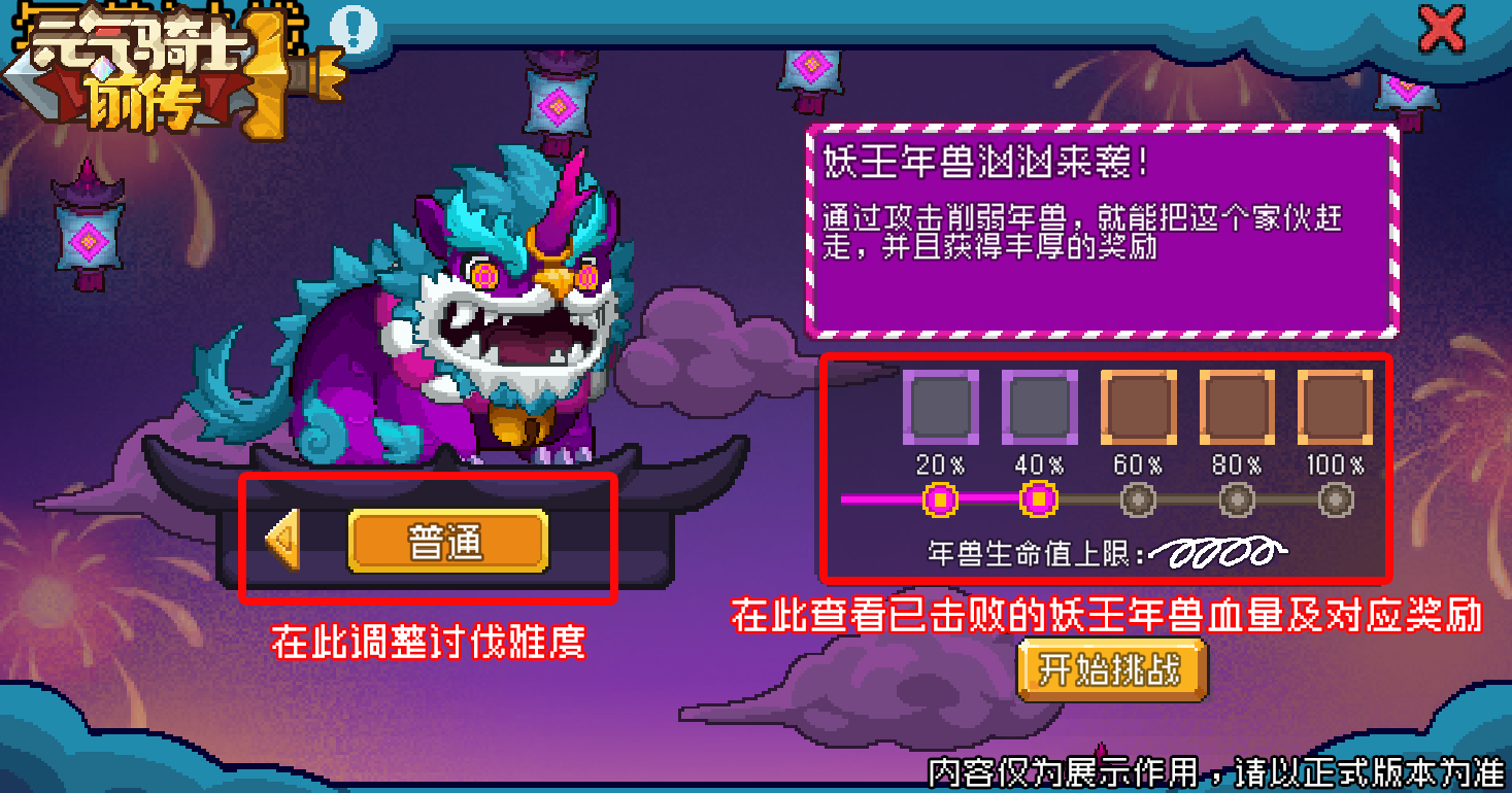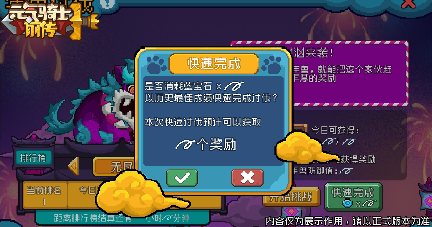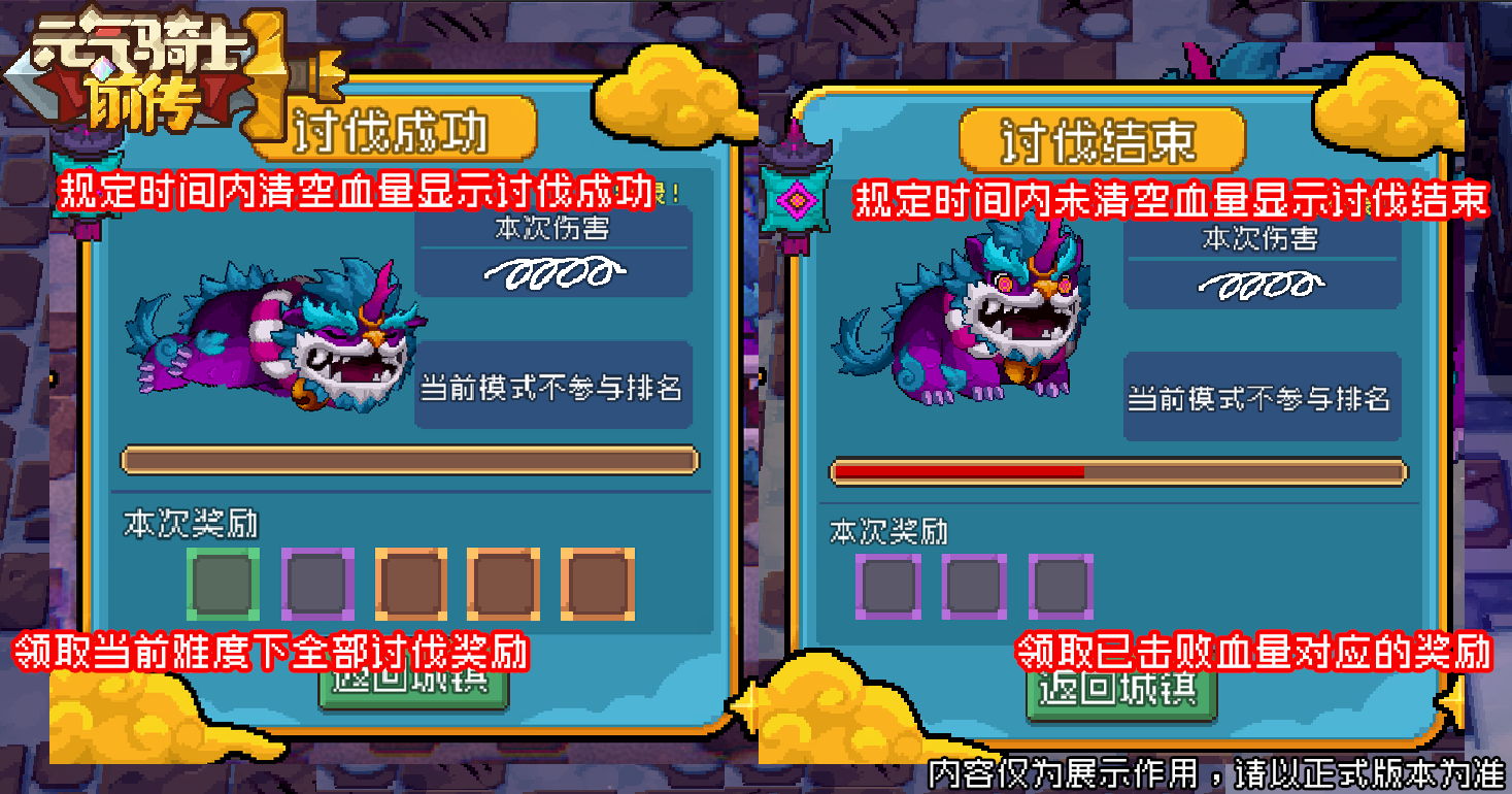 1、若小骑士在规定时间内清空妖王年兽血量,则为“讨伐成功”,会领取该难度下全部讨伐奖励并开启下一难度;