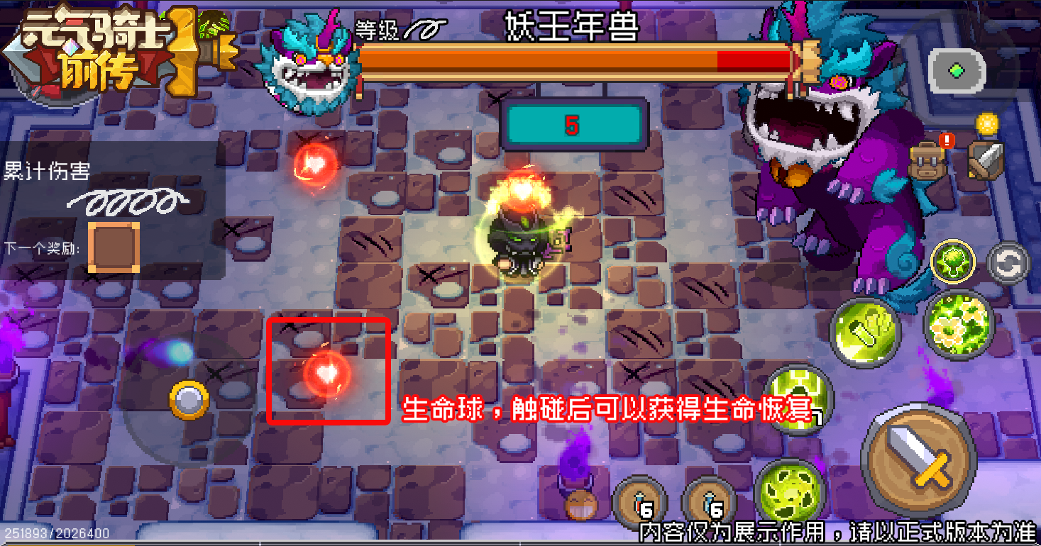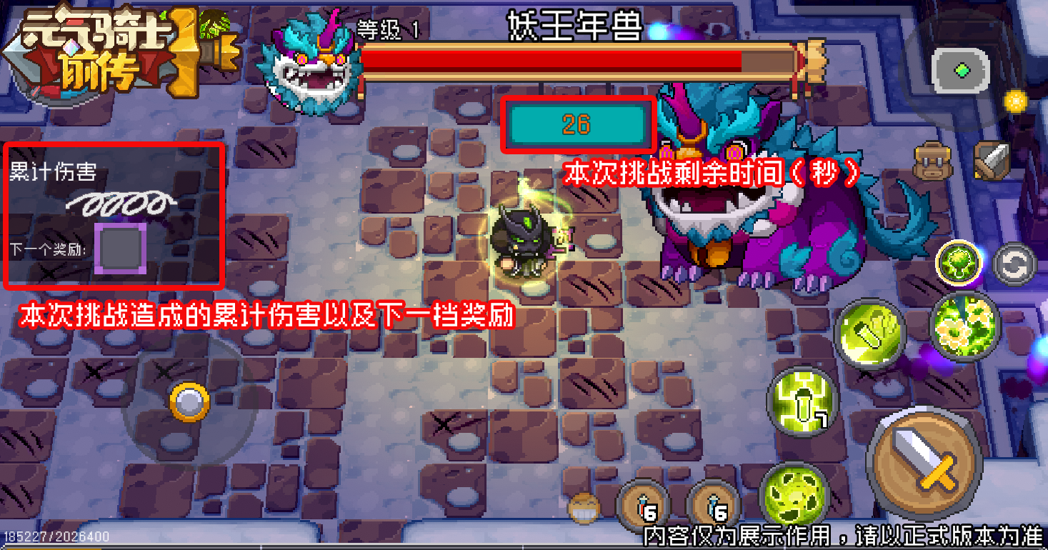 小骑士挑战妖王年兽时,游戏界面左侧会显示“当前已造成的伤害”以及“下一档奖励”,妖王年兽血量下方会显示“本次挑战的剩余时间”。