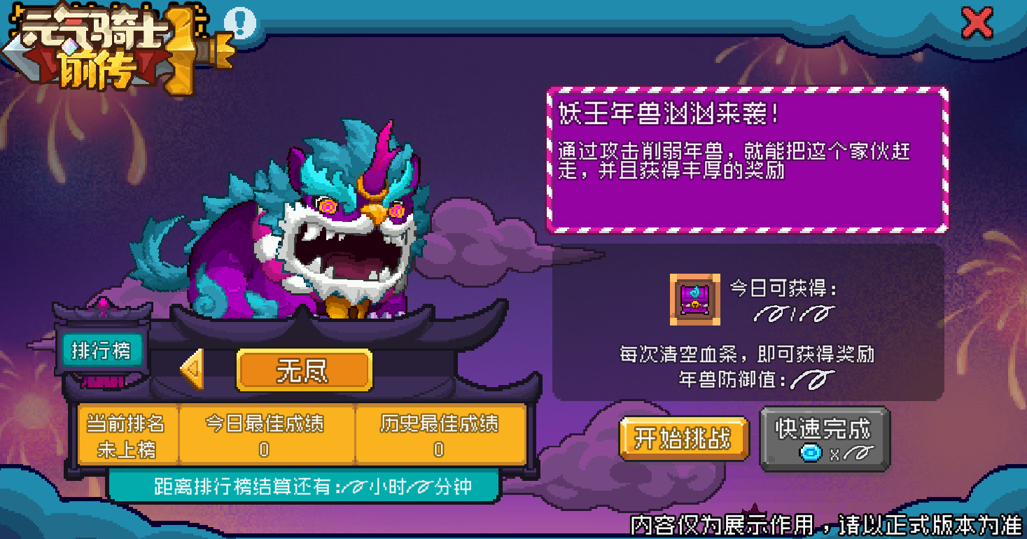 通关非无尽模式“极难”难度后,将会开启年兽讨伐的无尽模式。