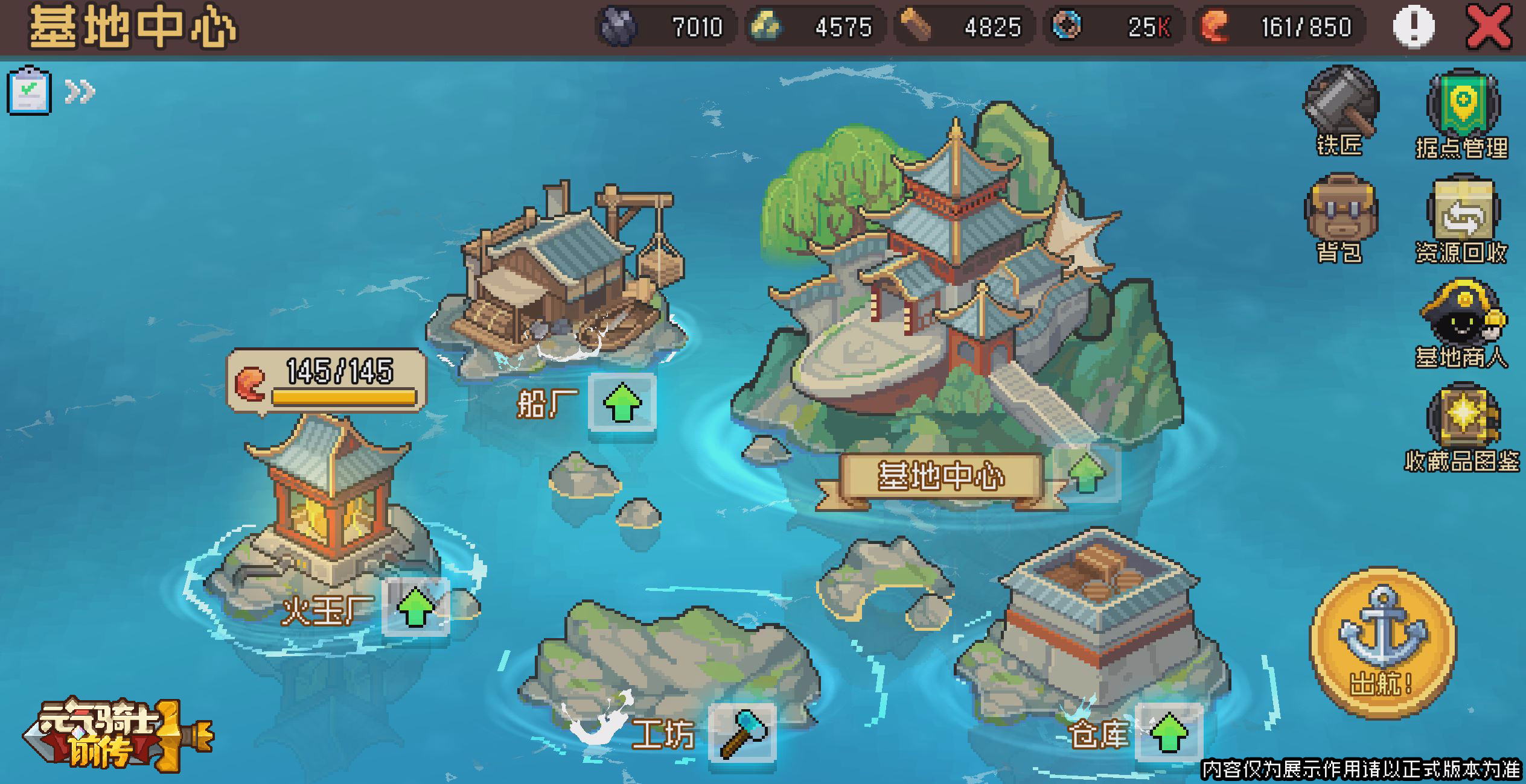 大航海玩法是游戏中后期的主要玩法,小骑士通过出海航行收集【核心物资】和【珍材】,途中可以进入不同岛屿收集资源或是遭遇战斗,出来之后获得对应的收益或者损失。大航海玩法会产出玩法货币“海洋通货”、装备、道具材料等等,包括秘卷道具、挖矿中的烟雾弹和炸弹也都会产出。