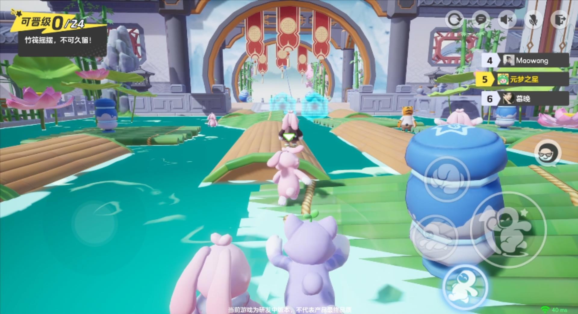 通过之后,面前又是一片池塘,这次的机关是竹筏、圆形滚筒。这些竹筏并不稳定,会因为对手踩上去而浮动摇晃,很容易落水,星宝们必须躲避人群,尽量选择人少的路径通过。