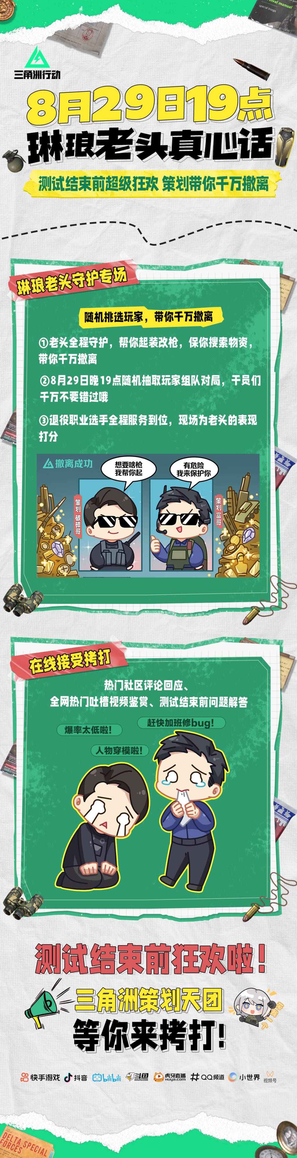 琳琅老头守护专场,随机挑选玩家,带你千万撤离!退役职业选手全程服务到位:帮你起装、帮你改枪,保你猛猛搜物资,带你千万撤离,让你感受测试结束前的狂欢!直播现场老头们还会回应社区吐槽评论和热点视频!8月29日晚19点,记得锁定“琳琅老头”直播间!