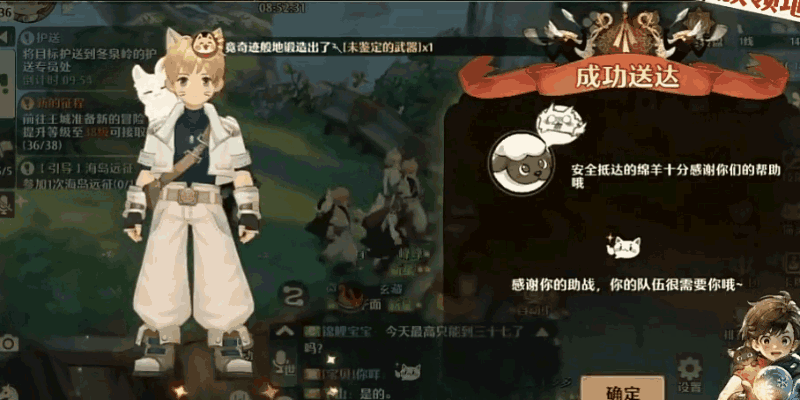 后续可推进护送任务,该任务操作难度较低,且完成后将额外附赠 “八音盒” 道具,道具内包含大量经验值;若采用组队模式完成该任务,还可进一步提升经验值获取效率。当玩家经验值达到当前等级上限后,可转向世界探索度提升与家园玩法等趣味内容。