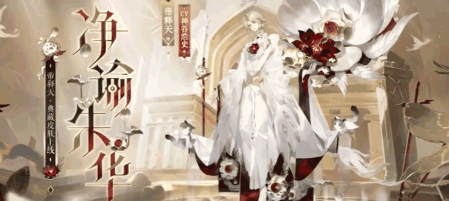 帝释天全新典藏皮肤「净谕朱华」同步上架皮肤屋,延续 “光暗交织” 的设计理念:纯白羽衣搭配鎏金纹饰,冠冕以枯骸为基底,背后血红色红莲随动作开合,技能释放时会浮现十字架光影与纷飞鸽群,配套专属语音、式神录背景板及动态头像框。