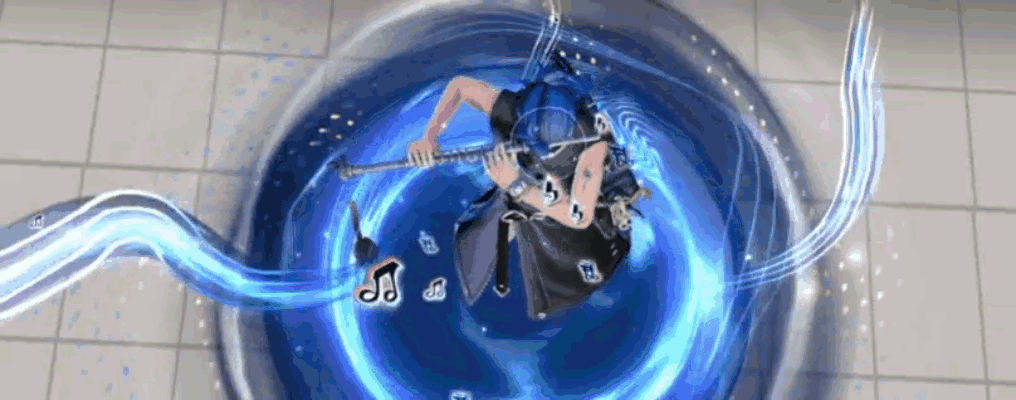 技能特效深度融合音乐元素:一技能挥剑时迸发蓝紫色音符流光,二技能穿梭留下声波轨迹,三技能落地生成旋转音浪场,大招释放时更是化作炫彩音波穿梭战场,完美契合 “潮流之声” 系列主题。