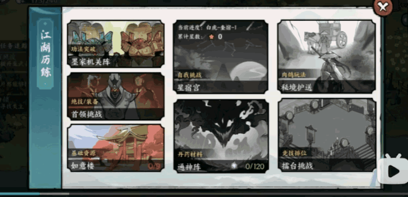 江湖历练包含多个特色玩法,各有实用价值。墨家机关阵是刷功法提升材料的专属场景,有多余体力时可来消耗,高效利用资源;如意楼是每日福利领取点,难度极低,每天上线必领,错过可惜。