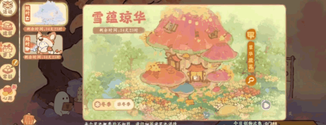 「雪蕴琼华」建筑池核心为甲等双形态建筑「蕈华麓苒」,当前呈现冰莹冬季形态,春季版本后可切换为童趣非冬季形态,放置云岫峰雪地区域可切回冬季形态。该建筑进阶后可制作「雪菇团」「琉璃树」等5种小景建筑,解锁专属头像框与「飞霜舞练」彩蛋,池内还含乙等「寒芝渡玉」「团菌阁簇」、丙等「鹿蹊冰」建筑。「冬趣吉临」装扮池上架两套甲等装扮「琼林驻影」「瑞冬雪客」,及多款乙丙级装扮与雪人、傻狍子主题萝卜皮肤。