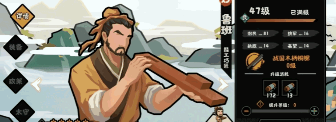 好多玩家都在问鲁班值不值得抽,小编觉得非常值得,尤其适合新手和缺民生、战斗类名臣的玩家!鲁班的核心玩法是 “造兵”,能打造刀车、冲车、投石车三种器械,其中自爆刀车堪称破局神器,打高难度关卡超好用。