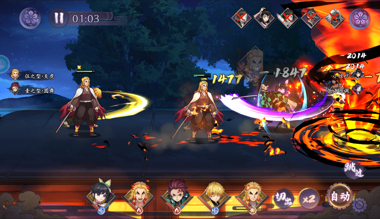 优势:炭治郎与祢豆子触发火焰联动,善逸提供闪避保护,悲鸣峪保障续航,适合主线推图和副本挑战。