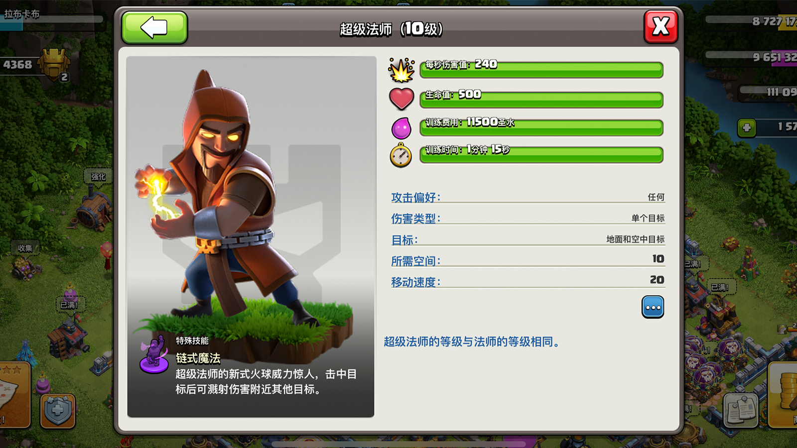 因为超级法师拥有极高的伤害,对比普通法术来说不仅增加了伤害能力,而且伤害方面也从球型伤害转变成了雷龙的电弧伤害,借助隐身和狂暴法术的加成可以轻松打掉一个密集建筑群,玩家完全可以借助攻城飞艇来打一场闪电战,而在8848打法当中也是一种后排主力兵种,对于经常使用8848打法或者飞艇爆本的玩家,在日常的时候超级法师是需要优先解锁的!