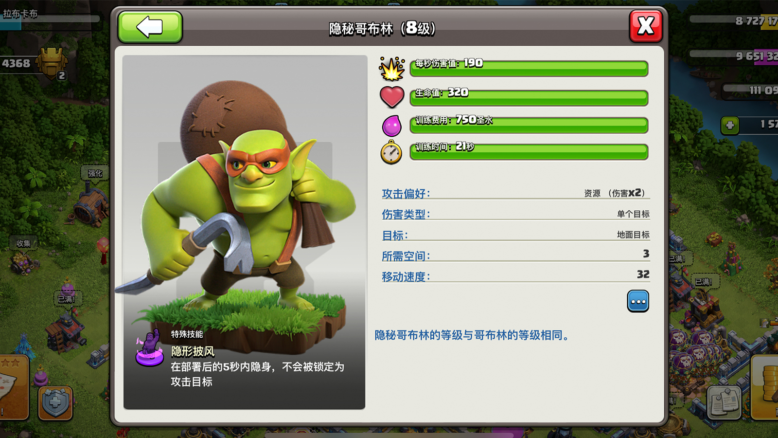 因为超级哥布林的体量相对于哥布林虽然提升了很多,但是在进攻能力方面却比普通哥布林强很多,特别是隐身能力,在进攻的时候可以借助隐身能力快速来到资源建筑旁边,而高额的伤害也能快速清理掉资源建筑获得资源,玩家想要快速获得资源,使用十几个超级哥布林就能轻松解决,虽然过程需要一定的降杯,但是获取资源的速度却加快了很多!